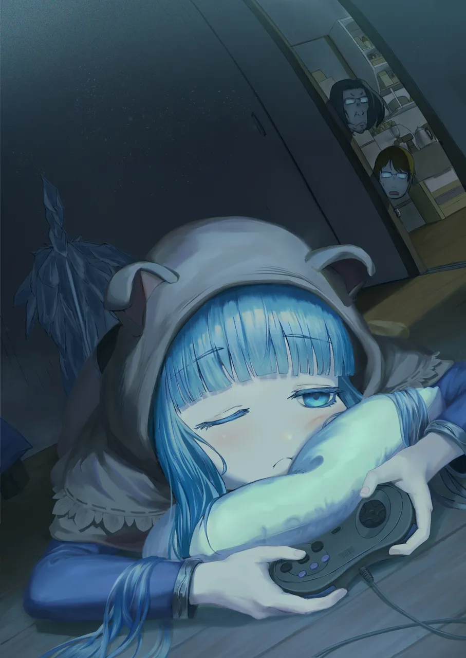 1girl2boysanimal_earsanimal_hoodblue_eyesblue_hairblunt_bangsclosed_mouthcontrollerdutch_anglefake_animal_earsfrownfull_bodygame_controllerholdingholding_controllerholding_game_controllerhoodhoodieindoorslong_hairlyingmultiple_boyson_stomachone_eye_closedpillowsolo_focus