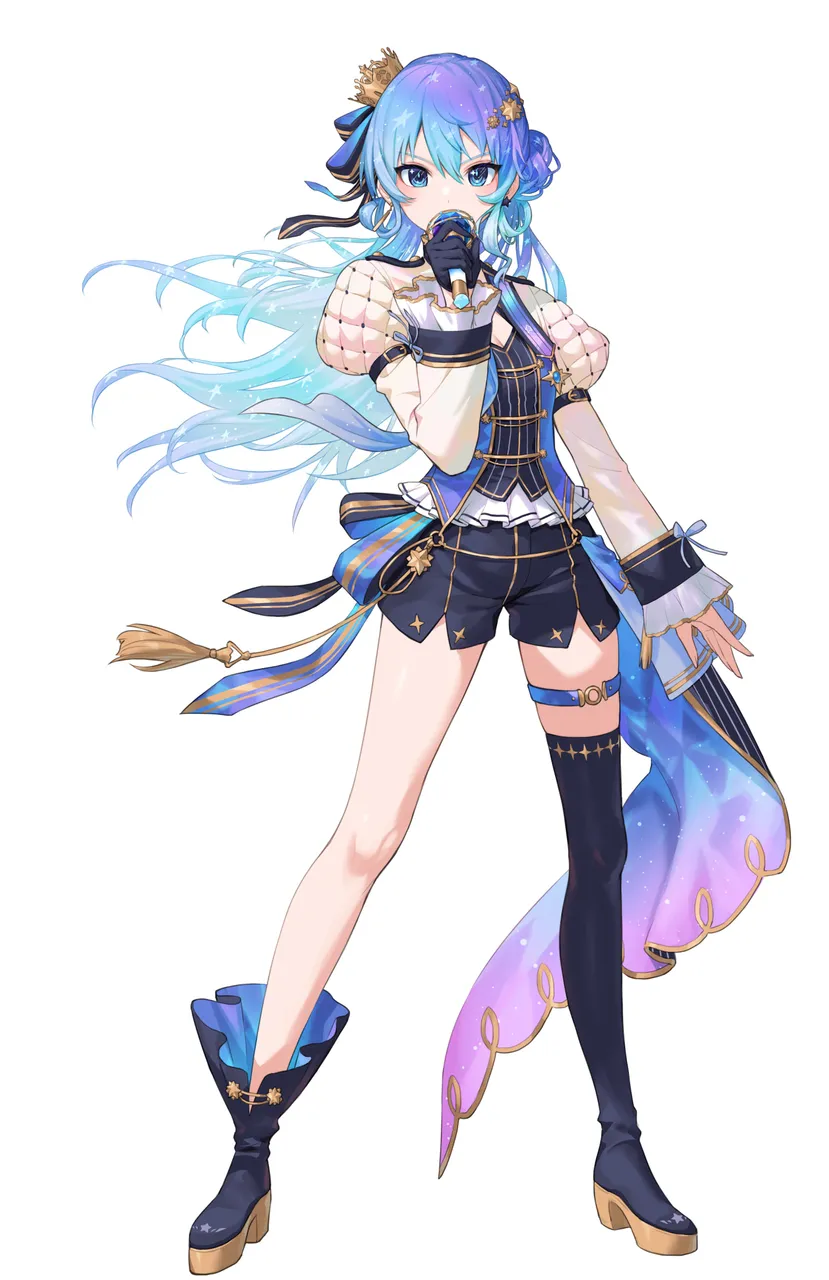 1girlasymmetrical_footwearasymmetrical_legwearblue_eyesblue_hairbootscrownearringsfull_bodyhair_ornamentholdingholding_microphoneidoljewelryjuliet_sleeveslong_hairlong_sleevesmicrophonemini_crownmismatched_footwearo-ringo-ring_thigh_strapofficial_alternate_costumeofficial_alternate_hair_lengthofficial_alternate_hairstylepuffy_sleevesshooting_starshortssimple_backgroundsolostar_(symbol)star_in_eyesymbol_in_eyethigh_bootsthigh_strapvestvirtual_youtuberwhite_backgroundzettai_ryouiki