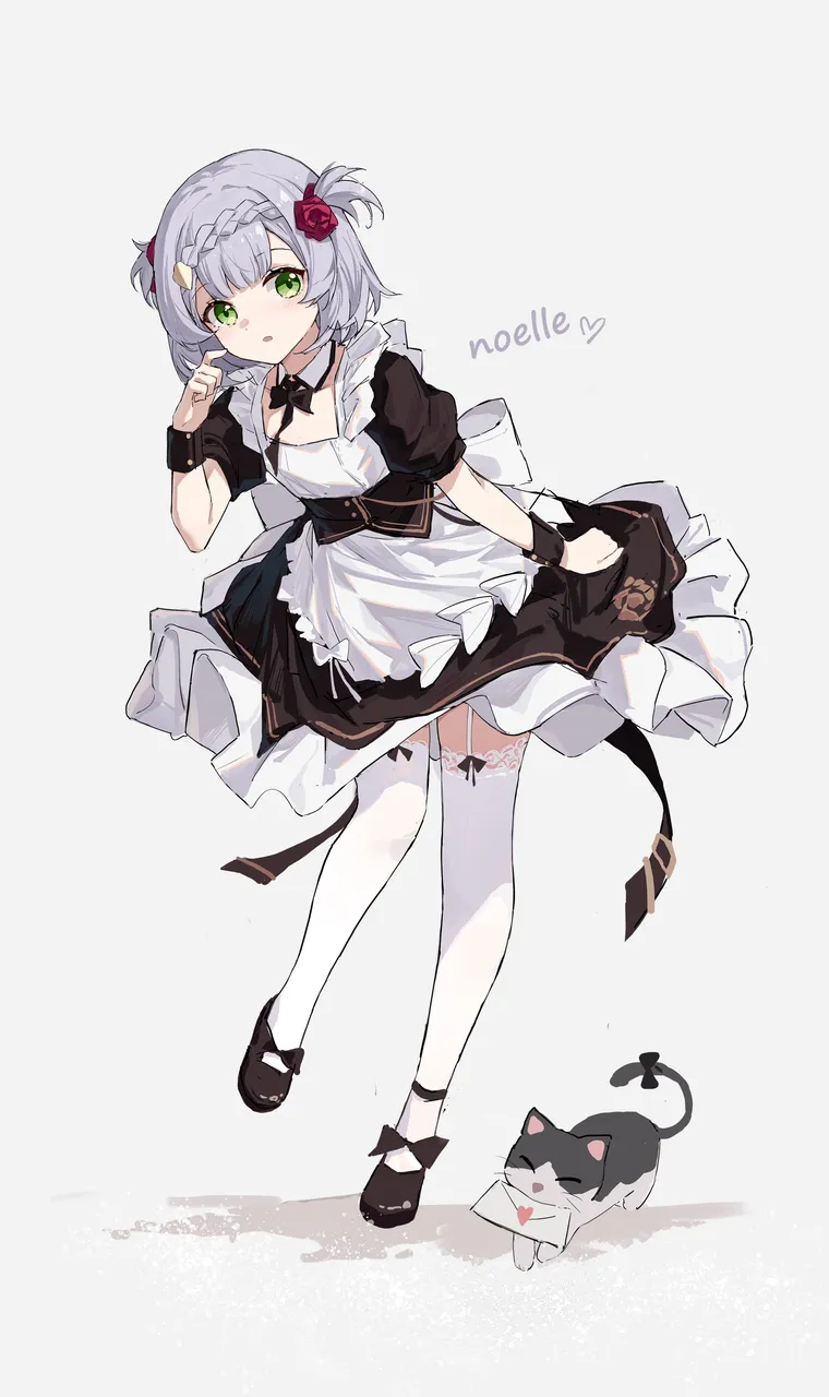 1girlaged_downalternate_costumeapronblack_bowblack_shoesbowbraidbraided_bangsbreastscatcharacter_nameflowerfull_bodygarter_strapsgreen_eyeslace-trimmed_thighhighslace_trimletterlooking_at_viewermaidmaid_apronmary_janesopen_mouthred_flowershoesshort_hairsimple_backgroundsmall_breastssolothighhighswhite_hairwhite_thighhighs
