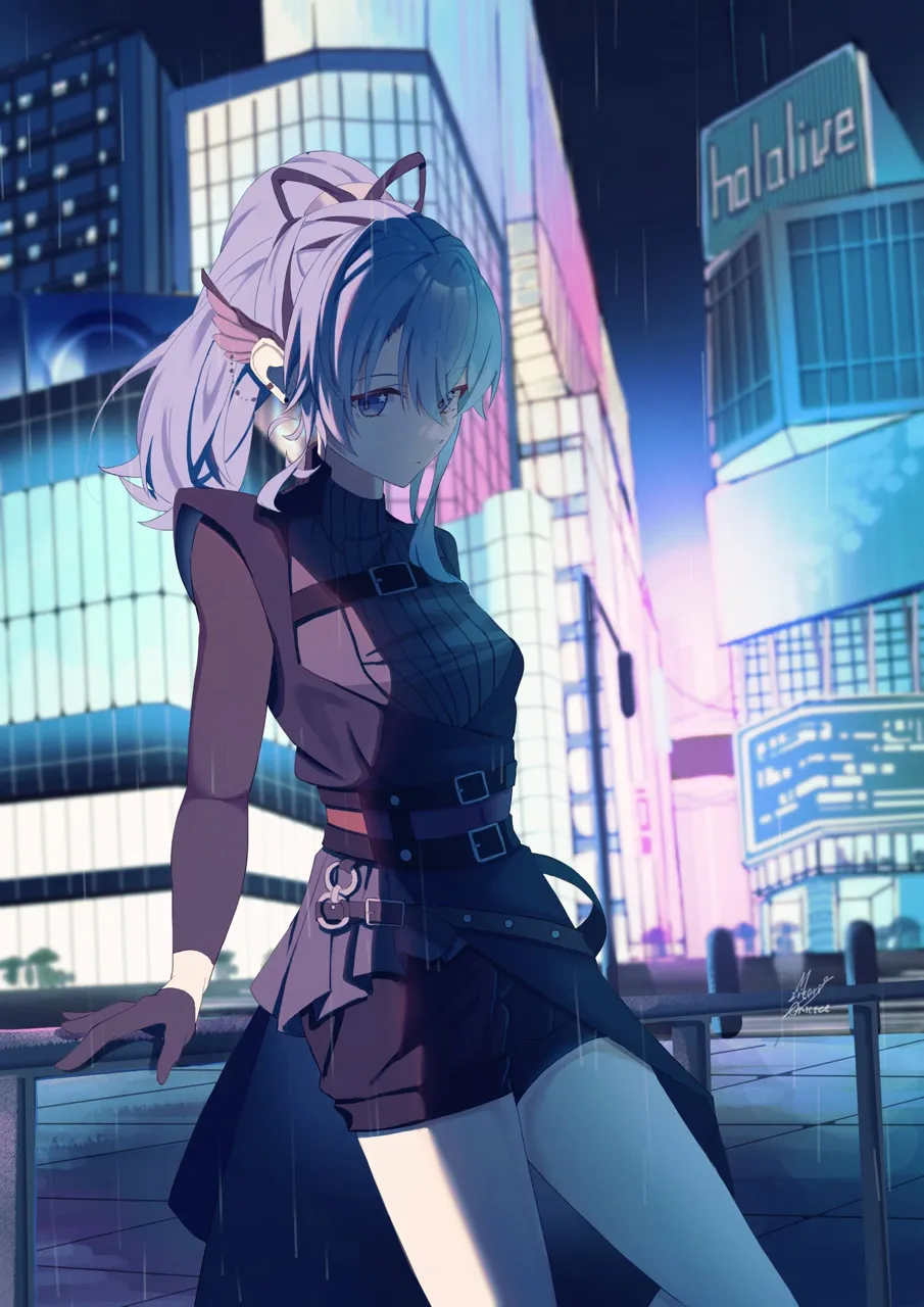 1girlagainst_railingarm_supportbillboardblack_glovesblack_shirtblue_eyesblue_haircitycopyright_namecowboy_shotexpressionlessgloveshair_between_eyeshair_ornamenthair_ribbonhigh_ponytaillong_bangslong_hairlong_sleeveslooking_at_viewerlooking_downnightoutdoorspensiveponytailrailingrainribbonroadshaded_faceshirtshort_shortsshortssidelockssignaturesolostar__symbolstar_in_eyestreetsymbol_in_eyethighsvirtual_youtuber