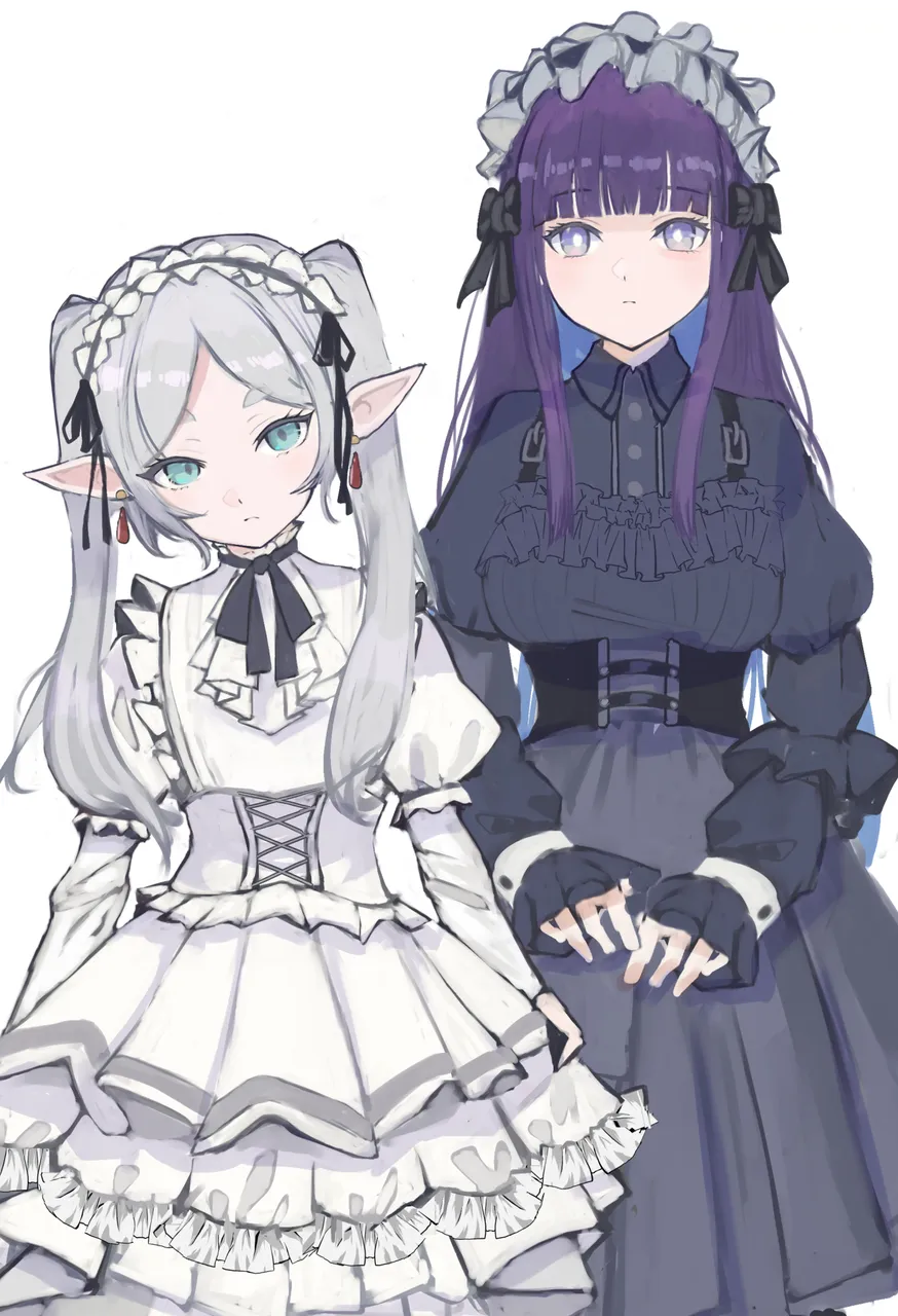 2girlsalternate_costumeapronascotblack_dressblack_headdressblunt_bangsbreastsclosed_mouthcollardressearringselfenmaidedexpressionlessfloating_earringsfrilled_dressfrilled_headwearfrilled_shirt_collarfrillsgreen_eyesheaddressjewelrylolita_fashionlong_hairlong_sleeveslooking_at_viewermaidmaid_apronmaid_headdressmultiple_girlsparted_bangspointy_earspurple_eyespurple_hairsidelockssimple_backgroundsketchstraight_hairtwintailsunconventional_maidwhite_dresswhite_hairwhite_headdresswrist_cuffs