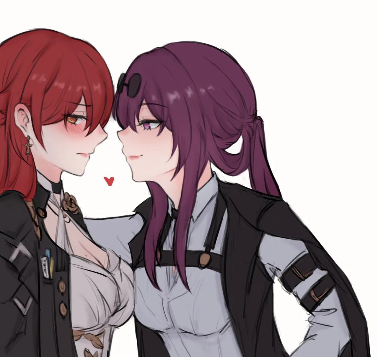 2girlsassertive_femaleblack_coatblushbreastsclosed_mouthcoatdressearringseyewear_on_headheartjewelrykabedonlong_hairlooking_at_viewermedium_breastsmultiple_girlsponytailpurple_eyespurple_hairred_eyesred_hairround_eyewearshirtsimple_backgroundsmileupper_bodywhite_backgroundwhite_dresswhite_shirtwhite_sleevesyellow_eyesyuri