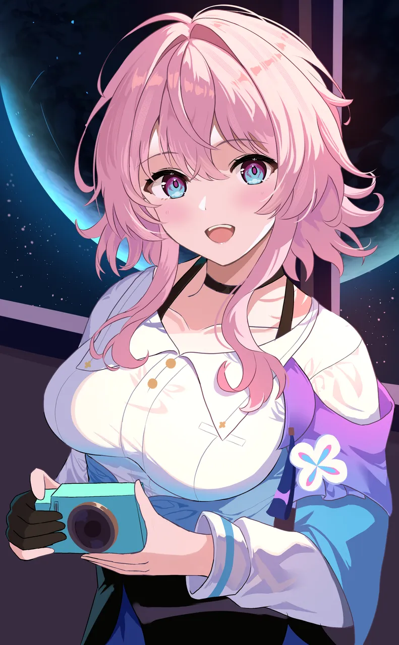 1girlarchery_shooting_gloveblack_chokerblue_eyescamerachokerglovesholdingholding_camerajacketlong_hairlong_sleeveslooking_at_viewermulticolored_eyesopen_mouthpartially_fingerless_glovespink_hairplanetpurple_eyessidelockssmilesolostar_(sky)teethtwo-tone_eyesupper_bodyupper_teeth_onlywhite_jacket