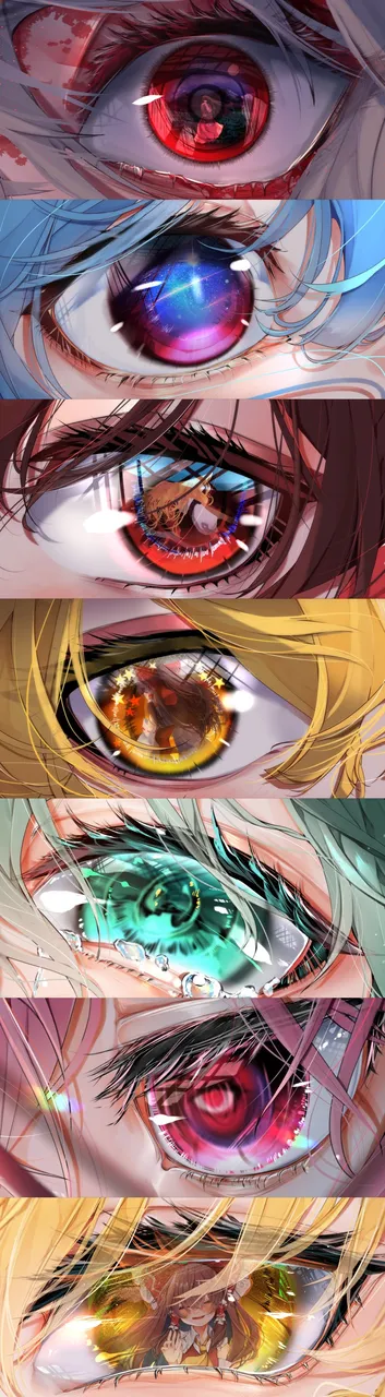 6+girlsblack_hairblonde_hairbloodblue_hairbowbrown_haireye_focuseye_reflectiongalaxygreen_eyesgreen_hairhair_between_eyeshair_tubeshatlong_hairlong_sleevesmultiple_girlspurple_hairred_bowred_eyesreflectionshort_hairsmiletearswhite_hairwitch_hatyellow_eyes