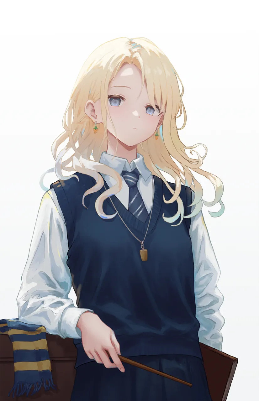 1girlblonde_hairblue_eyesblue_necktieblue_scarfblue_skirtblue_sweater_vestbookbreastsclosed_mouthcollared_shirtcowboy_shotdiagonal-striped_clothesdiagonal-striped_necktieearringsholdingholding_bookholding_wandjewelrylong_hairlong_sleeveslooking_at_viewermedium_breastsnecklacenecktiepleated_skirtscarfshirtsimple_backgroundskirtsolostriped_clothesstriped_scarfsweater_vestunworn_scarfwandwhite_backgroundwhite_shirt