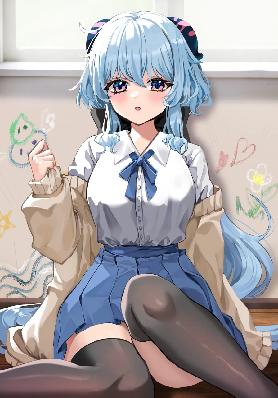 1girl:oalternate_costumeblack_thighhighsblue_bowblue_bowtieblue_hairblue_skirtbowbowtiebreastsbrown_cardigancardigancollared_shirtcontemporarydress_shirtfeet_out_of_framegoat_hornsgradient_eyesgraffitihair_between_eyeshand_uphearthornsindoorsknee_uplarge_breastslong_hairlooking_at_viewerminiskirtmulticolored_eyesoff_shoulderopen_cardiganopen_clothesparted_lipspleated_skirtpurple_eyesschool_uniformshirtshirt_tucked_insidelockssittingskirtsolothighhighsthighsvery_long_hairwallwhite_shirtwindowwooden_floorzettai_ryouiki